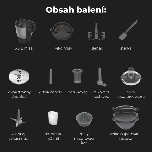 Mísa o objemu 3,5 l, víko mísy, šlehací metla, stěrka, 2stranný sekací disk, držák krouhacího nože, šťouchadlo, mixovací nástavec, víko kuchyňského robota, sekací nůž se 4 čepelemi, odměrka (30 ml), malý napařovací koš, víko napařovacího koše, vložka napařovacího koše a napařovací koš.
