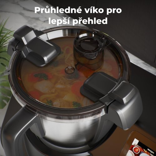 Díky průhlednému víku můžete mít svůj pokrm pod dohledem, aniž byste museli přerušit proces vaření. To je ideální pro vícestupňové recepty, které vyžadují pečlivou kontrolu, jako je redukce omáčky nebo rozpouštění čokolády. Jídlo je tak dokonale uvařené aniž byste museli přístroj otevírat a přerušovat proces vaření.