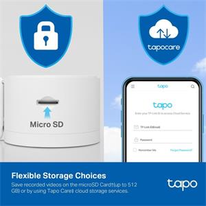 Úložiště Místní úložiště Slot pro kartu MicroSD na fotoaparátu (až 512 GB) Cloudové úložiště Služby cloudového úložiště Tapo Care (vyžaduje se předplatné)
