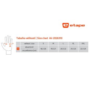 Cyklistické rukavice patří do základního vybavení každého správného cyklisty. Jednak při pádu chrání dlaně proti odření, zvyšují celkový komfort při jízdě a slouží zároveň i jako módní doplněk k vašemu cyklistickému oblečení. Krátkoprsté rukavice na kolo Etape AIR mají hřbet z elastického materiálu a síťoviny pro výbornou ventilaci, dlaň s gelovou výstelkou GelPro, která zajišťuje maximální ochranu ruky před otřesy, vibracemi a chrání ruku v případě pádu z kola, a protiskluzovou úpravou, silikonová oka TakeOff pro snadné svlékání, zesílení mezi palcem a ukazovákem pro otočné řazení, antibakteriální froté na palci pro utírání potu a jednoduché zapínání na suchý zip. - hřbet z elastického materiálu a síťoviny pro výbornou ventilaci - pohodlná dlaň s gelovou výstelkou GelPro a protiskluzovou úpravou - silikonová oka TakeOff pro snadné svlékání - zesílení mezi palcem a ukazovákem pro otočné řazení - antibakteriální froté na palci pro utírání potu - komfortní zapínání na suchý zip