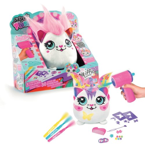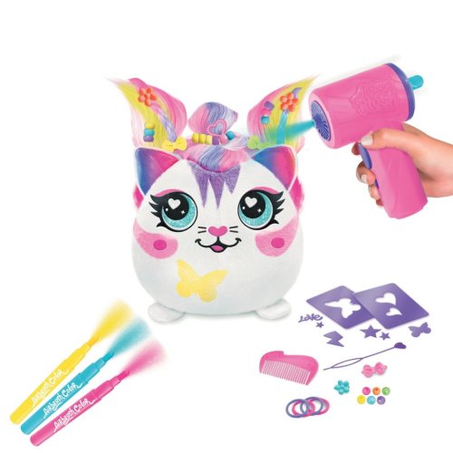 Airbrush kreativní sada Hair´iffic s vlasatým plyšákem skvěle zabaví každého. Uvnitř balení najdete jednoho plyšáka s vlásky, airbush nástroj na baterie (2 ks AA/LR6 – nejsou součástí balení), 3 fixy a 30 šablon, se kterými můžete plyšáka vyzdobit podle své fantazie. Když vás design omrzí, stačí plyšáka vyprat dle návodu a po uschnutí můžete znovu tvořit. Série obsahuje 2 druhy plyšáků – Princess a Precious.<br> Vhodné pro děti od 6ti let.