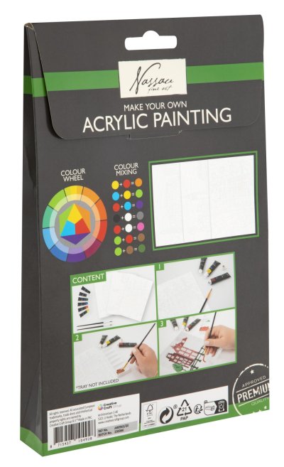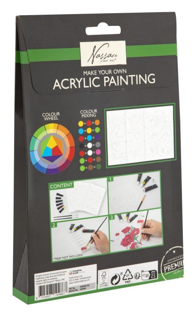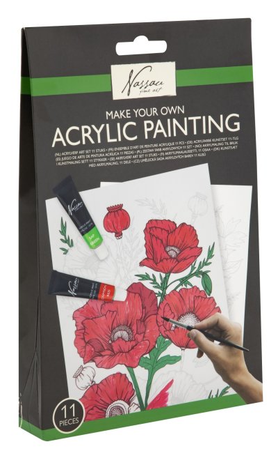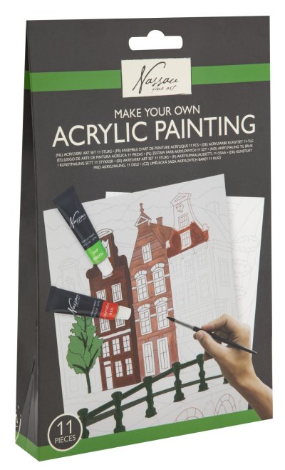 Akrylová malířská sada vám umožní realizovat vaše umělecké vize. V balení naleznete vysoce kvalitní akrylové barvy v různých odstínech a štětce spolu s předkresleným plátnem. Obal zároveň slouží jako návod a inspirace krok za krokem, jak vytvořit vlastní umělecké dílo. Plátno s předkresleným motivem vám poskytne dokonalý start, ať už jste začátečník nebo zkušený umělec. 4 asorty – hory, domy, páv a vlčí máky. Sada obsahuje 11 ks malířského příslušenství.