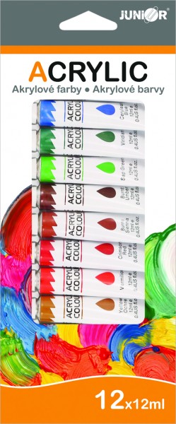 Akrylové barvy je možné použít pro malovaní na všechny běžné povrchy jako papír, lepenka, plátno. Barvy mohou být ředěny vodou. Balení obsahuje 12 x 12ml jasných odstínů. Vhodné pro děti od 3 let.