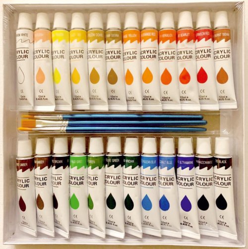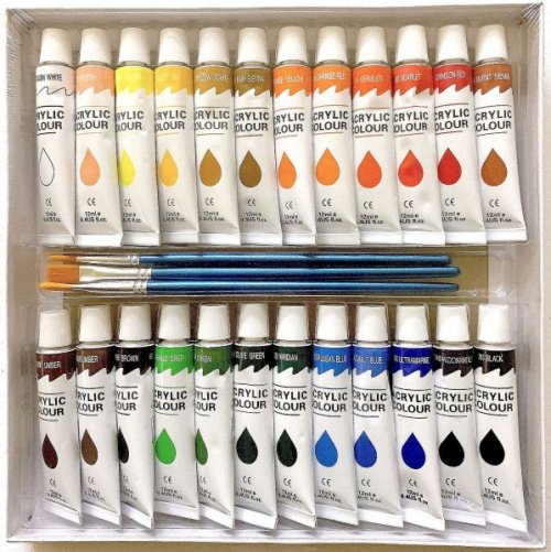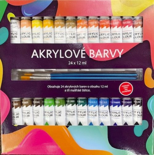 Barvy jsou vhodné na dřevo, keramiku, sklo, papír, plasty…balení obsahuje 24 akrylových barev v tubách po 12 ml a 3 štětce Rozměr krabičky: 22 x 22 x 2 cm Není hračka