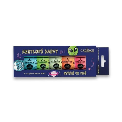 Efektové barvy, které pohlcují světlo a svítí ve tmě. Po určité době může efekt záře postupně odeznívat, namalovaný předmět je potřeba opět vystavit světlu a nabít ho. Barvy se nanáší se štětcem. Doporučujeme nanést aspoň dvě-tři vrstvy, nebo barvy nanášet na předmět již podmalovaný akrylovými barvami. Pomůcky lze snadno umýt mýdlem a vodou. Souprava obsahuje 5 ks barev, objem 30 ml.