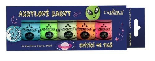 Akrylové barvy Glow in the Dark nejsou úplně krycí, nanášejte je ve více vrstvách nebo na podklad již podmalovaný akrylovou barvou. Vhodné na všechny povrchy, na rozmanité projekty. V, měkkém stavu jsou barvy ředitelné vodou, v zaschnutém stavu jsou naopak voděodolné. Barvy jsou všestranné, můžeme je nanášet nejen v tenkých vrstvách, ale i v pastózních nátěrech s, texturními efekty. Akrylové barvy jsou netoxické., TIPY NA POUŽITí:, * Před použitím protřepejte lahvičku s barvou., * Doporučujeme nanést aspoň 2–3 vrstvy nebo barvy nanášet na předmět již podmalovaný akrylovými barvami., * Sada obsahuje 5 barev, které mezi s sebou můžete libovolně míchat a vytvořit si tak další odstíny. Barvy míchejte tak, že do světlejší barvy postupně přidávejte druhou - tmavší, barvu po troškách, až docílíte požadovaného odstínu., * Při malování na kamínky je potřeba povrch kamínku omýt vodou, případně očistit pomocí kartáčku., * Akrylové barvy rychle schnou, proto je dobré mít štětce ponořené ve vodě a po skončení práce je pečlivě umýt a vysušit., * Po zaschnutí barev můžete dokreslovat detaily akrylovými fixami či tečkovat tekutými perlami., Tip: V nabídce máme i další sady akrylových barev - základní, pastelové, nebo metalické.,
