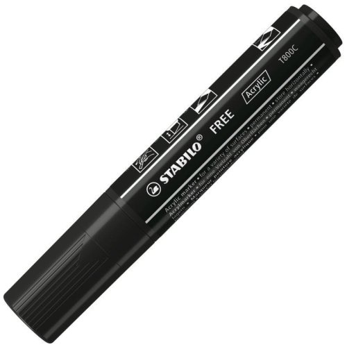 S řadou STABILO FREE Acrylic Marker můžete téměř neomezeně navrhovat a individualizovat. K dispozici jsou popisovače se třemi pečlivě vybranými variantami hrotů a až 20 krycími barvami. Neprůhledná a světlostálá pigmentová akrylová barva, vhodná na téměř všechny povrchy, od papíru přes kámen až po keramiku, umělou kůži a dřevo. Každý může nechat volný průběh své kreativitě při psaní, malování, značkování, šrafování a konturování.Akrylový popisovač s pigmentovaným inkoustem na vodní bázi.• ve třech šířkách stopy (T100, T300, T800C) s až 20 barvami.• vhodný na různé povrchy – papír, karton, plátno, kámen nebo umělou kůži. • neprůhledný, permanentní, voděodolný, lehký a odolný vůči povětrnostním vlivům• lze míchat a mísit s vodou• po zaschnutí hedvábně matný a přetíratelný• vyrobený z 50% recyklovaného plastu• snadná aktivace dobu 30 sekund a následné pumpování • horizontální skladování pro dlouhou životnost