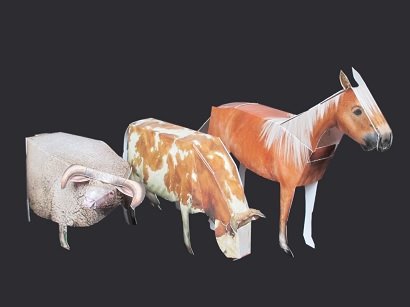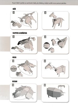Modely: kůň, slepice s kuřátky, koza, beran, kráva, prase, pes, husa