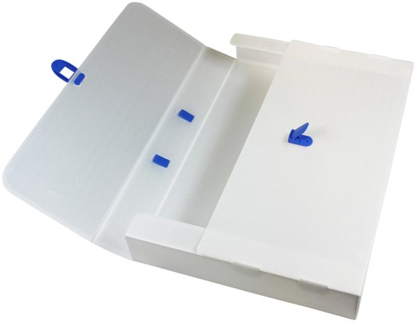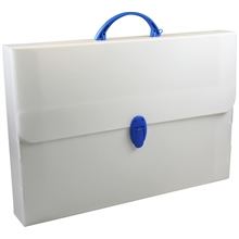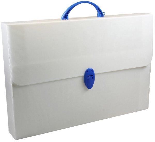 Aktovka s rukojetí a zámkem, vhodná pro uschování a přenos dokumentů do formátu A4 Materiál: odolný a omyvatelný polypropylen Tloušťka materiálu: 2,5 mm a 480 g/m2 Barva: bílá, rukojeť a zámek v modré …