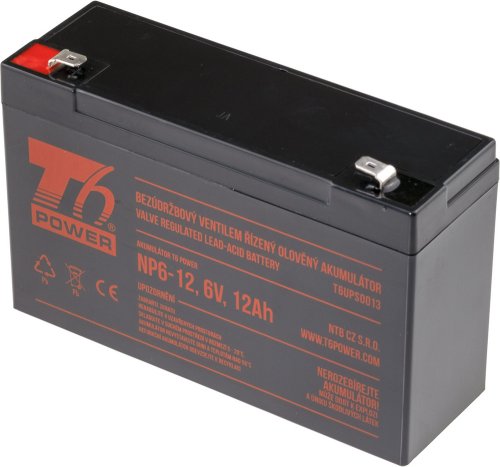 Bezúdržbový, ventilem řízený, olověný akumulátor české značky T6 Power NP6-12 je záložním zdrojem energie s kapacitou 12 Ah a napětím 6 V. Akumulátor NP6-12 využijete v menších zabezpečovacích systémech, případně také v protipožárních systémech.