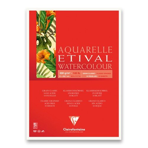 Akvarelový blok Clairefontaine Etival Classic Grain 300 g má 100% přírodní bílý celulózový papír, který je vhodný pro začátečníky a příležitostné uživatele.