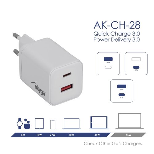 Akyga® AK-CH-28 je výkonná USB nabíječka s technologií GaN (nitrid galia), která nabízí dva porty – USB-C a USB-A. Díky kompaktním rozměrům a vysoké účinnosti je ideální pro každodenní použití doma, v kanceláři i na cestách.