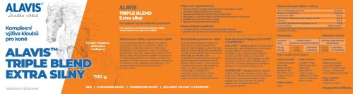 Kombinace chondroprotektivních látek (glukosamin sulfátu a chondrioitin sulfátu), látky MSM a značkových kolagenů COLLYSS™ a CARTIDYSS™. ALAVIS™ Triple Blend Extra Silný je vhodný pro regeneraci pohybového aparátu, zejména pro preventivní podávání u hříbat a koní v pracovní a sportovní zátěži.