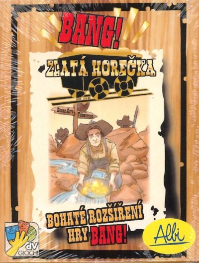 Nastala Zlatá horečka! Nejrychlejší pistolníci mohou ve hře vyrýžovat spoustu zlata. Kdo má zlato, může si nakoupit užitečné vybavení, které může pomoci při přestřelkách. Je ovšem třeba se mít na pozoru před stínovými pistolníky.... Mají jediný cíl, a to dostat Tě ze hry. Pospěš, ať jsi u zlatonosné říčky první! Zlatá horečka je rozšíření, ke kterému potřebujete základu hru Bang! a můžete ho libovolně kombinovat s ostatními rozšířeními hry Bang!. Hra obsahuje: kartu role stínového odpadlíka, 8 karet postav, 24 karet vybavení, 30 zlatých valounů (plastových), pravidla