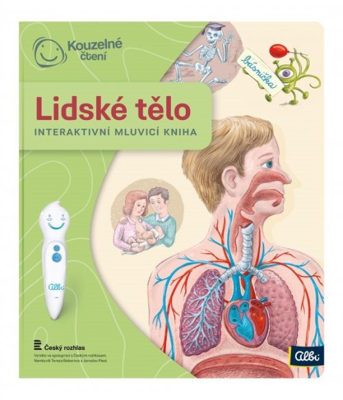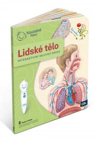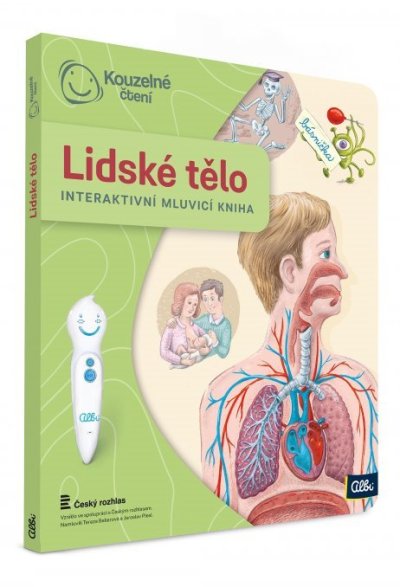 UPOZORNĚNÍ: Tato kniha funguje pouze s elektronickou tužkou ALBI (není součástí balení). Interaktivní mluvící kniha z edice Kouzelné čtení, se kterou se děti již od 3 let dozvědí spoustu zajímavých a užitečných informací o našem těle. Knihou Lidské tělo provází malý ufon Prokouk, který přiletěl z planety Po, aby prozkoumal taje lidského těla. Všemu se diví a není divu: na planetě Po funguje všechno úplně jinak! Postava Prokouka a poutavé ilustrace podněcují děti k postupnému objevování jednotlivých částí a soustav lidského těla. Kniha je členěna do 8 kapitol a témata jsou např. Kosti a svaly, Mozek a nervy, Rozmnožování, Trávicí soustava, Srdce a plíce atd. Na každé dvoustraně najdou malí i velcí průzkumníci návod na cvik. Když si všechny cviky propojí, vznikne sestava, kterou si mohou zacvičit a krásně se přitom protáhnout. V knize Lidské tělo najdete také básničky, zábavné kvízy a speciální ikony, které děti vybízí, aby si získanou informaci zkusili doslava na vlastní kůži. Kniha obsahuje téměř 2000 zvuků a textů. Knihu ilustroval Pavel Pecina, básničky napsal Robin Král, texty Lucie Ujcová. Vzniklo ve spolupráci s Českým rozhlasem, knihu namluvili Tereza Bebarová a Jaroslav Plesl. Kouzelné čtení je unikátní výukový systém, který vám přináší spoustu informací a zábavy. Stačí, když se lehce dotknete elektronickou tužkou obrázku nebo textu, ozve se příslušná informace, zvuk nebo hudba. Kouzelné čtení je určeno dětem v předškolním věku, tak dětem starším, ale bezpochyby zaujme i dospělé. Díky speciální technologii mohou knihy plně využívat i děti v předškolním věku, které ještě číst neumí. Samy si tak mohou „přečíst“ pohádku nebo se hravou formou naučit poznávat barvy, čísla, písmena či nejrůznější tvary. Kouzelné čtení - ilustrační video