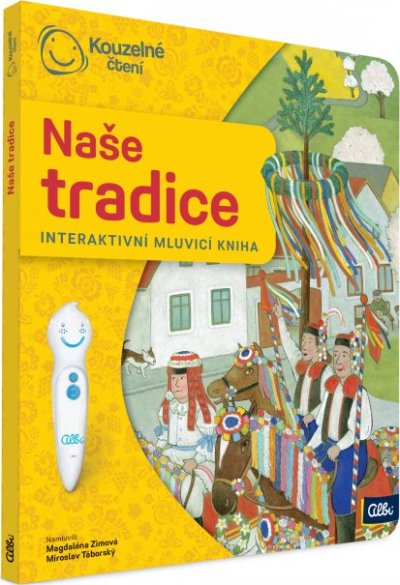 UPOZORNĚNÍ: Kniha Naše tradice funguje pouze s elektronickou tužkou ALBI (není součástí balení). Jaké jsou svátky a tradice typické pro náš národ? Kdy se daný svátek slaví , jaké jsou důvody jeho slavení a co je pro něj typické? Dětská kniha Naše tradice z edice Kouzlené čtení přehledně představuje jednotlivé svátky tak, jak jde kalendářní rok, a nejen dětem poutavou formou přibližuje pestrou paletu lidových zvyků a obyčejů . Kniha Naše tradice obsahuje přes 1800 zvukových stop . Namluvili Magdaléna Zimová a Miroslav Táborský. NECHTE KNIHY MLUVIT! Kouzelné čtení je unikátní výukový systém, který vám přináší spoustu informací a zábavy. Stačí, když se lehce dotknete elektronickou tužkou obrázku nebo textu, ozve se příslušná informace, zvuk nebo hudba. Kouzelné čtení je určeno dětem v předškolním věku, tak dětem starším, ale bezpochyby zaujme i dospělé. Díky speciální technologii mohou knihy plně využívat i děti v předškolním věku, které ještě číst neumí. Samy si tak mohou „přečíst“ pohádku nebo se hravou formou naučit poznávat barvy, čísla, písmena či nejrůznější tvary. Výhody Kouzelného čtení ALBI: