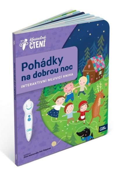 UPOZORNĚNÍ: Kouzelné čtení fungují pouze s elektronickou tužkou ALBI (není součástí balení). Interaktivní kniha Pohádky na dobrou noc z edice Kouzelné čtení je určená pro děti od 2 do 6 let. Pohádky si děti mohou nejen poslechnout, ale samy si je podle obrázků zkusit převyprávět. V knížce nechybí jednoduchý kvíz na ověření jejich znalostí. Tato knížka přináší osm pohádek pro nejmenší. Karkulka, Smolíček, Budulínek, Jeníček, Mařenka a další postavičky ožívají v krásných ilustracích Michaela Bergmannové. Zaposlouchejte se s dětmi do pohádek vyprávěných Zlatou Adamovskou a Petrem Štěpánkem. Kromě toho, že se děti s pohádkami seznámí, mohou se je samy podle obrázků naučit vyprávět. Stačí jen následovat pohádková klubíčka, která je příběhy provedou. Kniha Pohádky na dobrou noc obsahuje přes 500 zvuků a textů . NECHTE MODEL MLUVIT! Kouzelné čtení je unikátní výukový systém, který vám přináší spoustu informací a zábavy. Stačí, když se lehce dotknete elektronickou tužkou obrázku nebo textu, ozve se příslušná informace, zvuk nebo hudba. Kouzelné čtení je určeno dětem v předškolním věku, tak dětem starším, ale bezpochyby zaujme i dospělé. Díky speciální technologii mohou knihy plně využívat i děti v předškolním věku, které ještě číst neumí. Samy si tak mohou „přečíst“ pohádku nebo se hravou formou naučit poznávat barvy, čísla, písmena či nejrůznější tvary. Výhody Kouzelného čtení ALBI: