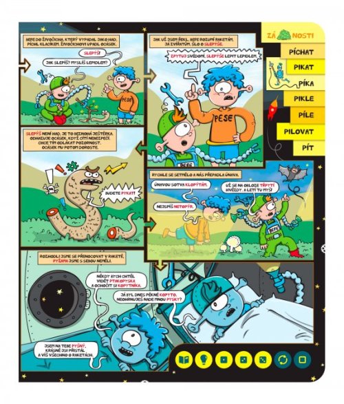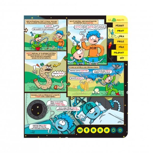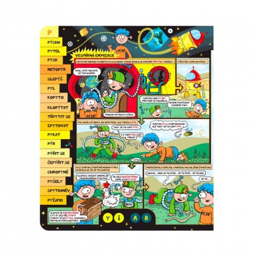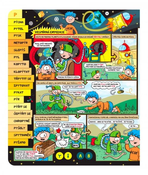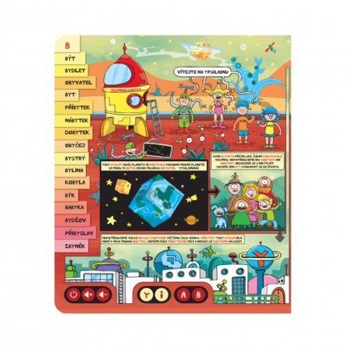UPOZORNĚNÍ: Vyjmenovaná slova fungují pouze s elektronickou tužkou ALBI (není součástí balení). Interaktivní mluvící kniha Vyjmenovaná slova z edice Kouzelné čtení seznámí děti od 8 let s vyjmenovanými slovy. Dětská kniha je zaměřená na úkoly a procvičování . Nechybí ani význam jednotlivých slov, nejběžnější příbuzná slova a uvedení pravopisně výjimečných slov. Knihou děti provází mimozemšťánci z planety Ypsilion Befe, Leme, Pese a Veze. Befe je vynálezce, Leme je sportovkyně, Pese miluje zvířata a Veze je jeho dvojče, talentované na jazyky. Spolu zažívají velká dobrodružství , která děti vtáhnou do děje plného vyjmenovaných a příbuzných slov. V knize Vyjmenovaná slova nechybí vtipné dialogy , zábavné kvízy ve 3 úrovních obtížnosti a v závěru knihy na děti čeká napínavý závod hlemýžďů. Kniha obsahuje přes 2800 zvuků a textů . Je namluvena známými českými herci. Vhodné pro děti od 8 let.