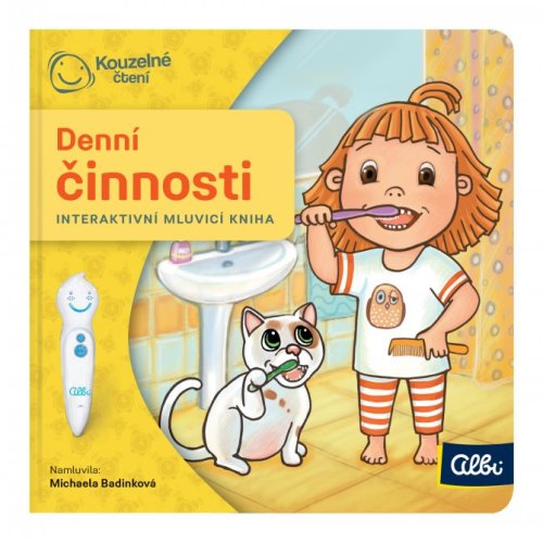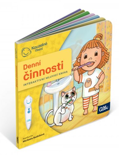 UPOZORNĚNÍ: Kniha Denní činnosti funguje pouze s elektronickou tužkou ALBI (není součástí balení). Děti stráví jeden den se sourozenci Honzíkem a Barborkou. Vstanou s nimi z postýlky, vyčistí si zoubky, dají si něco dobrého k obědu a pohrají si. Všechny činnosti v knize doprovází veselá písnička. V knize nechybí dialogy, říkanky a samozřejmě ani jednoduché zábavné kvízy. Kniha obsahuje přes 400 zvuků a textů. Knihu namluvila Michaela Badinková Doporučeno pro děti ve věku od 2 let. NECHTE KNIHY MLUVIT! Kouzelné čtení je unikátní výukový systém, který vám přináší spoustu informací a zábavy. Stačí, když se lehce dotknete elektronickou tužkou obrázku nebo textu, ozve se příslušná informace, zvuk nebo hudba. Kouzelné čtení je určeno dětem v předškolním věku, tak dětem starším, ale bezpochyby zaujme i dospělé. Díky speciální technologii mohou knihy plně využívat i děti v předškolním věku, které ještě číst neumí. Samy si tak mohou „přečíst“ pohádku nebo se hravou formou naučit poznávat barvy, čísla, písmena či nejrůznější tvary. Výhody Kouzelného čtení ALBI: