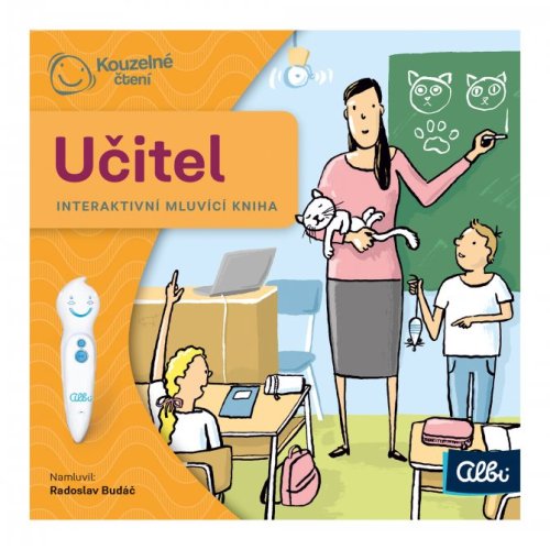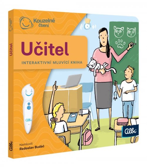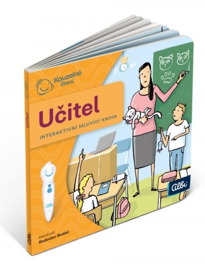 UPOZORNĚNÍ: Kniha Učitel funguje pouze s elektronickou tužkou ALBI (není součástí balení). Interaktivní mluvící mini kniha Učitel seznámí děti od 5 let s povoláním učitele. S Elektronickou Albi tužkou se podívají nejen do třídy a do kabinetu , ale i na lyže nebo na výlet do historie . V knize na ně čeká přes 500 zvuků a textů . Nechybí jednoduchý kvíz , který procvičí získané znalosti. Knihu namluvil Radoslav Budáč. Doporučeno pro děti ve věku od 5 let. NECHTE KNIHY MLUVIT! Kouzelné čtení je unikátní výukový systém, který vám přináší spoustu informací a zábavy. Stačí, když se lehce dotknete elektronickou tužkou obrázku nebo textu, ozve se příslušná informace, zvuk nebo hudba. Kouzelné čtení je určeno dětem v předškolním věku, tak dětem starším, ale bezpochyby zaujme i dospělé. Díky speciální technologii mohou knihy plně využívat i děti v předškolním věku, které ještě číst neumí. Samy si tak mohou „přečíst“ pohádku nebo se hravou formou naučit poznávat barvy, čísla, písmena či nejrůznější tvary. Výhody Kouzelného čtení ALBI: