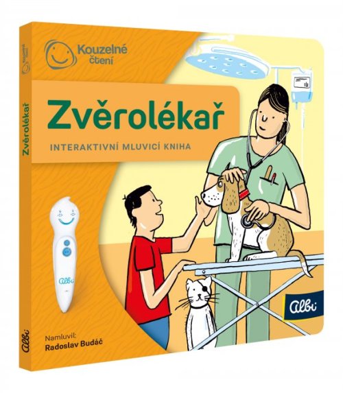 UPOZORNĚNÍ: Kniha Zvěrolékař funguje pouze s elektronickou tužkou ALBI (není součástí balení). Interaktivní mluvící mini kniha Zvěrolékař seznámí děti od 5 let s povoláním zvěrolékaře. S Elektronickou Albi tužkou poznají nástroje, které ke své práci potřebuje, jaká zvířata léčí i jak se máme starat o domácí mazlíčky. V knize na ně čeká přes 500 zvuků a textů. Nechybí jednoduchý kvíz, který procvičí získané znalosti. Knihu namluvil Radoslav Budáč. Doporučeno pro děti ve věku od 5 let. NECHTE KNIHY MLUVIT! Kouzelné čtení je unikátní výukový systém, který vám přináší spoustu informací a zábavy. Stačí, když se lehce dotknete elektronickou tužkou obrázku nebo textu, ozve se příslušná informace, zvuk nebo hudba. Kouzelné čtení je určeno dětem v předškolním věku, tak dětem starším, ale bezpochyby zaujme i dospělé. Díky speciální technologii mohou knihy plně využívat i děti v předškolním věku, které ještě číst neumí. Samy si tak mohou „přečíst“ pohádku nebo se hravou formou naučit poznávat barvy, čísla, písmena či nejrůznější tvary. Výhody Kouzelného čtení ALBI: