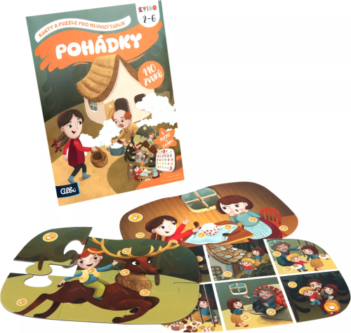 V sadě naleznete 1 oboustranné puzzle a 2 oboustranné obrázkové karty – obojí s ozvučenými obrázky, zvuky a kvízy. Audio je již nahrané v základní sadě Mluvicího tablíku, takže není potřeba si soubory stahovat. Složené puzzle či kartu stačí pouze položit přes ikony do tablíku. Aktivity s Mluvicím tablíkem podporují rozvoj smyslového vnímání, poznávání, paměti a jemné motoriky. Děti poslechnou tyto 3 krásné příběhy - O Smolíčkovi, Hrnečku vař a O perníkové chaloupce.