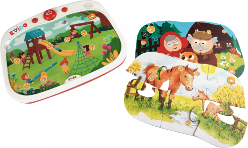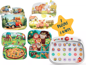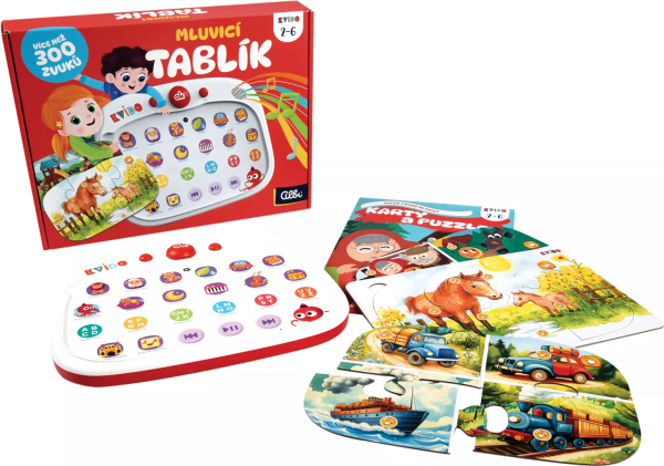 Děti mohou samy poslouchat více než 300 zvuků zvířátek, přírody, dopravy, pohádek, písniček, říkanek a mnoho dalšího. Navíc si složí puzzle s různým počtem dílků, poslechnou si ozvučené části obrázků a vyzkouší si zábavné kvízy. Složené puzzle či kartu stačí pouze položit přes ikony do tablíku. Aktivity s Mluvicím tablíkem podporují komunikaci, rozvoj smyslového vnímání, poznávání, paměti a jemné motoriky. Pokud si chcete rozšířit svou sbírku o nová témata, další puzzle a karty lze zakoupit samostatně. Pro provoz jsou třeba 3ks baterie typu AAA (nejsou součástí balení). Balení obsahuje: dotykovou tabulku – Mluvicí tablík, 2 oboustranné puzzle (4 motivy s dopravními prostředky a zvířátky z farmy s ozvučenými obrázky a kvízy), 2 oboustranné ozvučené karty (4 obrázky s motivy dětského hřiště, pískoviště a české pohádky O Koblížkovi se zvuky a kvízy), adaptér na stahování dalších zvukových souborů.
