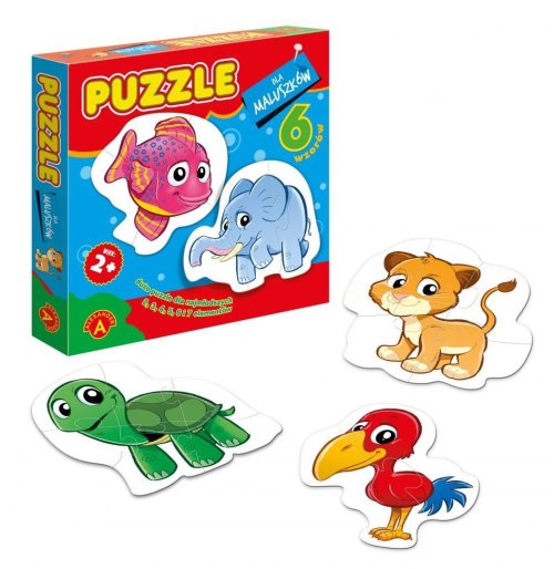 šest progresívních puzzle od 2 do 7 dílků velké a silné dílky pro snadnější držení rozvíjíí dětskou pozornost, podporují psychomotorický vývoj, představivost a podněcují zvědavost obrázky s oblíbenými dětskými motivy