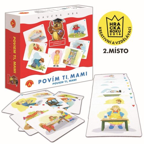 Didaktická hra pro děti od 3 let, která učí chápat zábavnou formou časové posloupnosti a rozvíjí vyjadřovací schopnosti dětí. Povídejte si s dětmi pomocí obrázků. Hra Povím Ti, mami vyhrála 2. místo "Hračka roku 2016" v kategorii Vzdělávací a kreativní hračky. Princip hry spočívá ve správném sestavení karet tak, aby vznikl logický příběh. Hra obsahuje 40 obrázků na destičkách, ze kterých je třeba sestavit 10 logických příběhů. Každý příběh potom hráči-děti svými slovy vypráví ostatním spoluhráčům nebo rodičům. Skládání příběhů usnadňují barvené značky, kterou jsou shodné na všech 4 kartách jednoho příběhu. Hra učí děti chápání časových posloupností a logickému myšlení. Zdokonaluje vyjadřovací schopnosti dětí (vhodné hlavně pro předškoláky), rozvíjí jejich představivost, postřeh a schopnost vizuální analýzy a vzájemnou komunikací posiluje vztah dětí a rodičů. Při pravidelném používání se děti "rozmluví" a naučí se rychleji vyjadřovat. Hlavní vlastnosti: originální způsob chápání časových posloupností a logickému myšlenízdokonaluje vyjadřovací schopnosti dětí vzdělávací a kreativní hračka Dokumentace: návod ke hře CZnávod ke hře SK