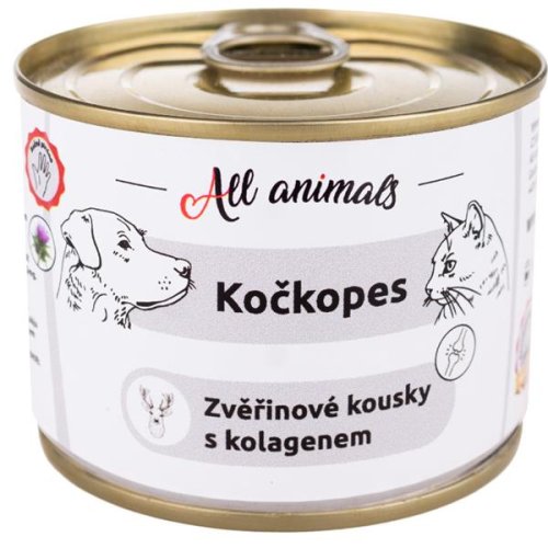 Monoproteinová konzerva All Animals s kolagenem představuje superprémiové krmivo pro psy a kočky všech velikostí a plemen. Obsahuje kousky zvěřiny doplněné o kolagen, který podporuje funkčnost pohybového aparátu. Konzerva je vyrobena bez obilovin, dochucovadel i konzervačních a barvících látek. Jde o velmi chutné, výživné a snadno stravitelné krmivo. Šetrné zpracování zaručuje lahodnou chuť i vůni. Vyrobeno v?České republice, z lokálních surovin. S přídavkem oleje z ostropestřce mariánského.