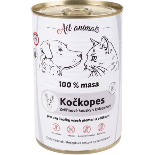 Monoproteinová konzerva All Animals s kolagenem představuje superprémiové krmivo pro psy a kočky všech velikostí a plemen. Obsahuje kousky zvěřiny doplněné o kolagen, který podporuje funkčnost pohybového aparátu. Konzerva je vyrobena bez obilovin, dochucovadel i konzervačních a barvících látek. Jde o velmi chutné, výživné a snadno stravitelné krmivo. Šetrné zpracování zaručuje lahodnou chuť i vůni. Vyrobeno v?České republice, z lokálních surovin. S přídavkem oleje z ostropestřce mariánského.