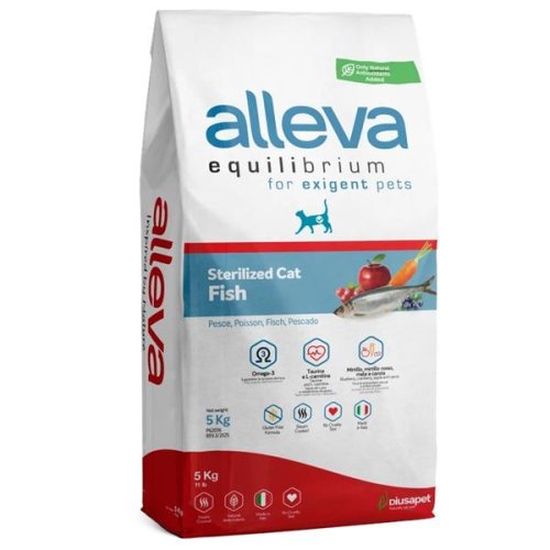 Bezlepkové krmivo Alleva Equilibrium Adult Sterilized Fish je kompletní a vyvážená receptura pro dospělé kastrované kočky a kočky žijící pouze v domácnosti. Vysoký obsah sledě (50 %) poskytuje kvalitní a snadno stravitelný zdroj bílkovin. Sleď a rybí olej z něj dodávají omega-3 a omega-6 mastné kyseliny pro zdraví kůže a lesk srsti, zatímco taurin a L-karnitin podporují kardiovaskulární systém a metabolismus. Vláknina z hrachu a čekanky, inulin, FOS a MOS pomáhají udržovat vyvážený střevní mikrobiom a trávení. Přírodní antioxidanty (borůvky, brusinky, jablko a mrkev) pomáhají chránit buňky před stárnutím a posilovat imunitní systém. Granule se vyrábějí v severní Itálii převážně z místních surovin. Hlavní přednosti:
