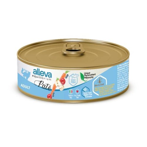 Složení: losos 92 %, ovoce (jablko, mrkev, borůvka) 4 %, minerální látky, xylóza. Analytické složky: vlhkost 79,8 %, hrubý protein 8,2 %, hrubý tuk 8,1 %, hrubá vláknina 0,3 %, hrubý popel 2,4 %, omega-3 mastné kyseliny 0,5 %, DHA 0,2 %, EPA 0,3 %. Doplňkové látky na 1 kg: Nutriční: vitamín A 4 000 MJ, vitamín D3 170 MJ, vitamín E 41 mg, taurin 1 000 mg, 3b101 (Fe: 1,58 mg), 3b405 (Cu: 0,24 mg), 3b502 (Mn: 5,25 mg), 3b201 (I: 0,09 mg), 3b603 (Zn: 6,42 mg), 3b801 (Se: 0,0054 mg). Technologické: kasiová guma 2 700 mg. Metabolizovatelná energie: 1 049,78 kcal/kg; 4,39 MJ/kg Krmný návod: Podávejte při pokojové teplotě pro zvýraznění aroma a chutnosti. Po otevření uchovávejte v chladničce a spotřebujte do 24 hodin. Může se podávat samostatně nebo v kombinaci se suchým krmivem Alleva Equilibrium, a to v souladu s pokyny k dávkování, aby byl zajištěn správný denní příjem živin. Kočce vždy zajistěte stálý přístup k čerstvé pitné vodě.