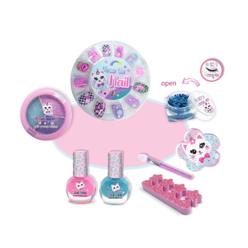 V balení najdete třpytky na tělo a obličej, nalepovací barevné nehty, oční stíny, pilníček na nehty, 2 laky na nehty, odělovač prstů pro lakování nehtů.