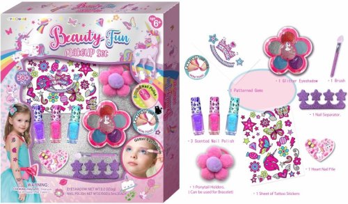 Sada obsahuje: obsahuje 3 slupovací laky na nehty, ozdobné kamínky, tetování a oční stíny se štětečkem.
