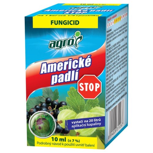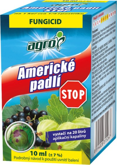 AGRO Americké padlí STOP je účinný postřikový fungicid se systémovým působením. Přípravek používejte k ochraně angreštu a černého rybízu proti americkému padlí. Ochráníte tak rostlinu před napadením (prevence), ale také po infekci (kurativní účinek). TIP: přípravek lze použít proti padlí i na jiných rostlinách (např. jádroviny, okurky, rajčata, jahodník, papriky, cukety apod.)