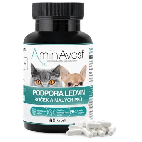 Dietetický veterinární přípravek AminAvast pro správnou funkci ledvin u koček a malých psů do 10 kg pomáhá udržovat správné hladiny kreatininu a močoviny (BUN). Chrání buňky (zvláště tubulární renální), zvyšuje glomerulární filtraci a glukoneogenezi a snižuje ztrátu bílkovin ve svalstvu. Má protizánětlivý účinek, snižuje krevní tlak v ledvinách a zvyšuje renální vasodilataci i hladinu hormonů, které přispívají k obnově ledvinné tkáně. Obsahuje přirozeně se vyskytující aminokyseliny a peptidy. Vhodný jako doplněk diet s omezeným obsahem bílkovin. Použití: chronické renální selhání Složení (účinné látky v jedné kapsli 300 mg): 50 mg glycin, 50 mg L-glutamin, 50 mg kyselina L-glutamová, 50 mg kyselina L-asparagová, 50 mg L-karnosin, 25 mg L-histidin, 25 mg L-arginin. Dávkování: kočka do 4,5 kg – 1 kapsle 2× denně kočka nad 4,6 kg – 2 kapsle 2× denně (U koček o hmotnosti 5–10 kg lze použít přípravek AminAvast pro psy (1 000 mg) v dávkování ½ kapsle 2× denně.) pes do 5 kg – 1 kapsle 2× denně pes 5–10 kg – 2 kapsle 2× denně Způsoby podání: Kapsle lze aplikovat rovnou do tlamy zvířete, případně lze obsah kapsle vysypat a zamíchat do vlhkého krmiva. Pokud je zvíře zvyklé přijímat výhradně suché krmivo, doporučujeme krmivo navlhčit, aby k němu obsah kapsle lépe přilnul. Dále je možné obsah kapsle smíchat s menším množstvím vody a takto podávat rovnou do tlamy. Doba užívání: Přípravek lze podávat krátkodobě i dlouhodobě (případně preventivně). Dvouletá klinická studie nepotvrdila žádné vedlejší účinky. Kontraindikace: Každá kapsle obsahuje 215 mg standardního maltodextrinu, jehož účinek je třeba brát v úvahu u zvířat trpících zvýšenou hladinou glukózy v krvi. Skladování: Skladujte na suchém místě při pokojové teplotě. Upozornění: Veterinární přípravek je určený pouze pro zvířata. Uchovávejte mimo dosah dětí.