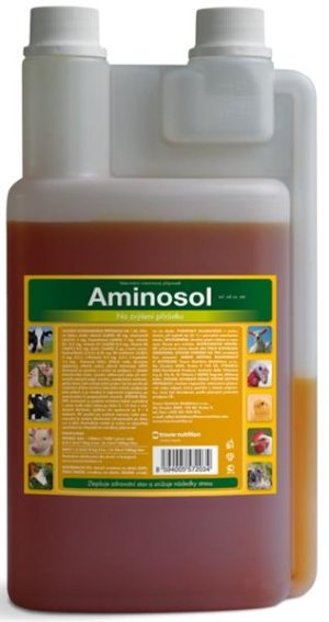 Problém: V některých případech dochází ke snížení příjmu krmiva, např. při stresu, změně krmiva, při a po průběhu onemocnění. Tyto stavy mají za důsledek zpomalení růstu, snížení užitkovosti a tím zhoršení ekonomických ukazatelů. Složení v 1 ml: sodík 6,3 mg, hořčík 0,07 mg, cholinchlorid 20 mg, niacinamid 2 mg, D - panthenol 1 mg, vitamin B2 0,5 mg, vitamin B1 0,5 mg, vitamin B6 0,5 mg, biotin 3 μg, L - lysin HCl 8 mg, DL - methionin 3 mg, L - threonin 4,2 mg, L - tryptofan 1,5 mg. Způsob aplikace: Aminosol se podává zvířatům řádně rozředěný v pitné vodě nebo mléce po dobu 5 – 15 dnů v uvedených dávkách. Aplikaci lze opakovat po 3 – 4 týdnech. Při použití po zvýšené námaze nebo onemocnění je možno dávkování zdvojnásobit po dobu cca 3 dnů. Roztok je nutno připravovat denně čerstvý, chránit před přímým slunečním světlem a co nejrychleji spotřebovat. Nepodávat neředěný přípravek! Dávkování: