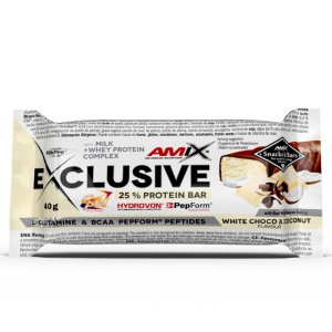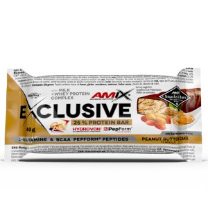 Exclusive bar je proteinová tyčinka s minimálním obsahem bílkovin 25 %. Dovolujeme si Vám představit absolutní novinku v oblasti proteinových tyčinek na našem trhu. Exclusive Protein Bar jako jediná v ČR obsahuje nejkvalitnější patentované zdroje bílkovin - MilkPro® Protein Blend. Při výrobě našich produktů pečlivě dbáme na použití těch nejkvalitnějších značkových surovin. Ani u Exclusive Protein Bar tomu není jinak. Jako zdroj bílkovin jsme použili MilkPro® Protein Blend, která obsahuje pouze patentované suroviny CFM® syrovátkový bílkovinný izolát a koncentrát, částečně hydrolyzovaný syrovátkový izolát HydroVon®. Dále jsme přidali hydrolyzované peptidy (L-glutamin PepForm®, BCAA PepForm®). Benefity: