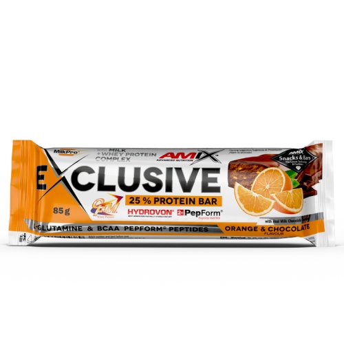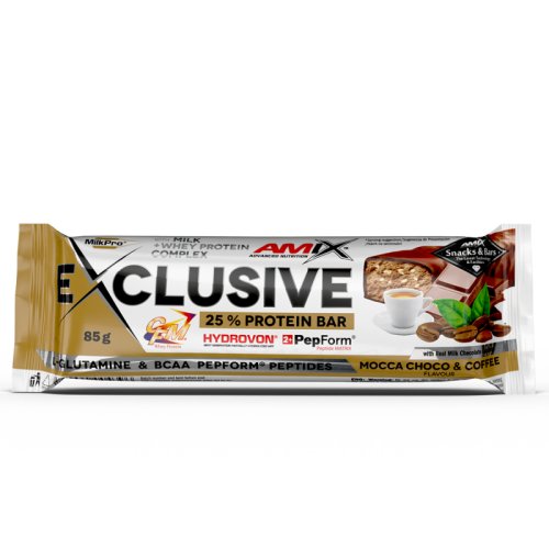 Exclusive bar je proteinová tyčinka s minimálním obsahem bílkovin 25 %. Dovolujeme si Vám představit absolutní novinku v oblasti proteinových tyčinek na našem trhu. Exclusive Protein Bar jako jediná v ČR obsahuje nejkvalitnější patentované zdroje bílkovin - MilkPro® Protein Blend. Při výrobě našich produktů pečlivě dbáme na použití těch nejkvalitnějších značkových surovin. Ani u Exclusive Protein Bar tomu není jinak. Jako zdroj bílkovin jsme použili MilkPro® Protein Blend, která obsahuje pouze patentované suroviny CFM® syrovátkový bílkovinný izolát a koncentrát, částečně hydrolyzovaný syrovátkový izolát HydroVon®. Dále jsme přidali hydrolyzované peptidy (L-glutamin PepForm®, BCAA PepForm®). Benefity:
