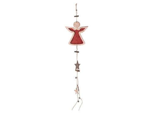Anděl dřevo 150x160mm na zavěšení, přírodní s glitrem, červená