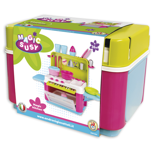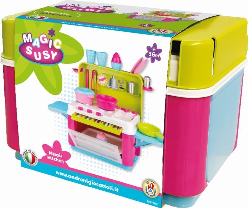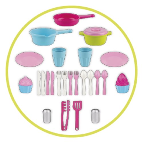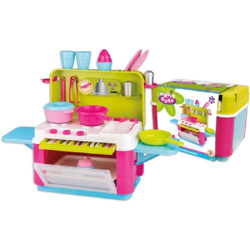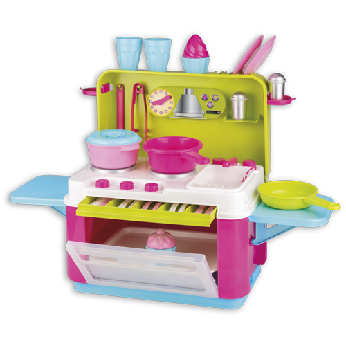 Cestovní pultová kuchyňka s dvěma bočními, nosnými, odnímatelnými deskami, vyrobená z kvalitních plastů v Itálii. Obsahuje: sadu příborů pro 4 děti, zásuvku na příbory, troubu s plechem, varnou desku, mycí dřez s baterií, tři hrnce, dvě sklenice, dva talířky, dvoje kleště, slánku, pepřenku a 2x cupcake. Rozměry ve složeném stavu: výška 41 cm, délka 28,5 cm, šířka 28,5 cm. Váha: 3 kg. Doporučený věk od 36 měsíců.