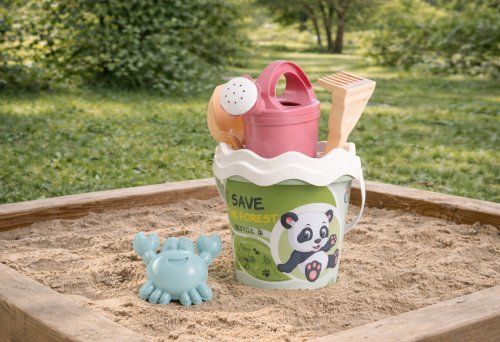 6dílná sada na písek, vyrobená z kvalitních recyklovaných plastů v pastelových barvách v Itálii. Obsahuje: Kyblík, konvičku 0,5 l, sítko, lopatku, hrabičky a tvořítko ve tvaru mořského kraba. Kyblík: průměr 17 cm, výška 16 cm. Sada: výška 32 cm, váha 0,314 kg. Doporučený věk od 10 měsíců.