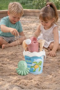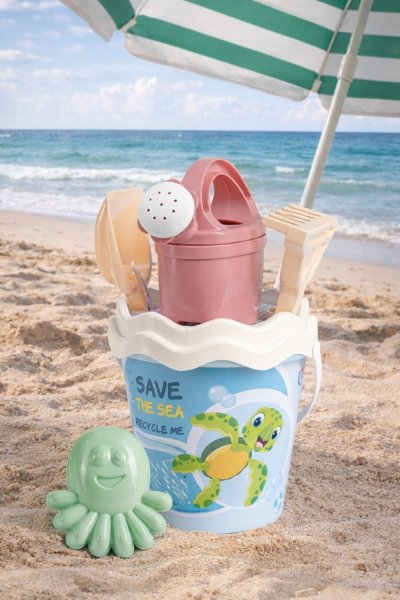 6dílná sada na písek, vyrobená z kvalitních recyklovaných plastů v pastelových barvách v Itálii. Obsahuje: Kyblík, konvičku 0,5 l, sítko, lopatku, hrabičky a tvořítko ve tvaru chobotnice. Kyblík: průměr 17 cm, výška 16 cm. Sada: výška 32 cm, váha 0,314 kg. Doporučený věk od 10 měsíců.