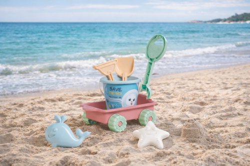 6dílná sada na písek, vyrobená z kvalitních plastů v pastelových barvách v Itálii. Obsahuje: vozík s rukojetí, jejíž konec lze využít jako sítko, kyblík, lopatku, hrabičky a tvořítka ve tvaru rybky a hvězdice. Rozměry vozíku: 27 x 22 x 10 cm (d x š x v), délka rukojeti 30 cm, kyblík o průměru 17 cm a výšce 16 cm. Sada: 30 x 22 x 27 cm (d x š x v). Váha: 0,528 kg. Doporučený věk od 10 měsíců.