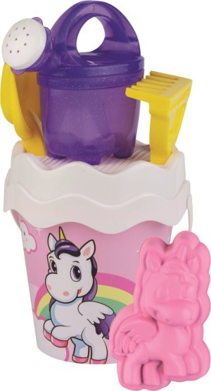 Souprava obsahuje: kyblík s motivem jednorožce (výška 11 cm), lopatku, hrábě, konvičku, sítko a formičku s motivem plameňáka.