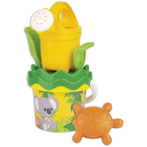6dílná sada na písek, vyrobená z kvalitních plastů v Itálii. Obsahuje: Kyblík, konvičku 0,5 l, sítko, lopatku, hrabičky a tvořítko ve tvaru želvičky. Kyblík: průměr 13 cm, výška 11 cm. Sada: výška 29 cm, váha 0,35 kg. Doporučený věk od 12 měsíců. Výrobce, italská firma Androni Giocattoli sídlící nedaleko Milána, se specializuje na výrobu plastových hraček na písek a zahradu a také stavebnic UNICO Plus již od roku 1974. Jejím mottem je heslo: Androni Toys: Kvalita vyrobená v Itálii. Používané plasty jsou pevné, ale zároveň pružné a při běžném hraní nedochází k jejich praskání. Vydrží i větší zátěž a proto jsou výrobky vhodné i do školek, kde téměř denně procházejí zatěžkávací zkouškou.