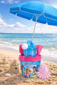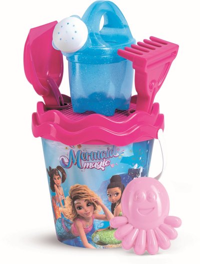 6dílná sada na písek, vyrobená z kvalitních recyklovaných plastů v Itálii. Obsahuje: Kyblík, konvičku se třpytkami 0,5 l, sítko, lopatku, hrabičky a tvořítko ve tvaru chobotnice. Kyblík: průměr 17 cm, výška 16 cm. Sada: výška 32 cm, váha 0,314 kg. Doporučený věk od 10 měsíců.