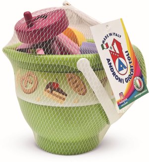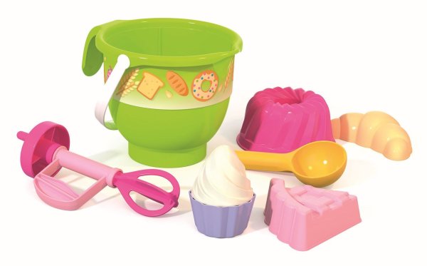 6dílná sada na písek, vyrobená z kvalitních plastů v Itálii. Obsahuje: 1 kyblík na písek ve tvaru vyší mísy s uchem, 1 tvořítko ve tvaru bábovky, 1 tvořítko na dortík, 1 kopečkovač na zmrzlinu a 1 ruční šlehač. Baleno v síťce o rozměrech 18 x 18 x 20 cm. Váha: 0,333 kg. Doporučený věk od 10 měsíců.