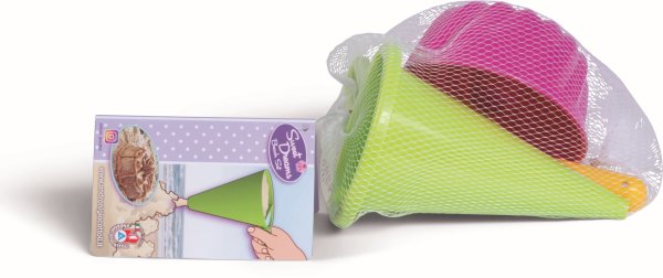 3dílná sada na písek, vyrobená z kvalitních plastů v Itálii. Obsahuje: 1 dekoraterský trychtýř pro míchání písku a vody a vytáření kreativních muffinů a jiných výtvorů, 1 tvořítko ve tvaru bábovky, 1 kopečkovač na zmrzlinu. Baleno v síťce o rozměrech 11 x 18x 17 cm. Váha: 0,122 kg. Doporučený věk od 10 měsíců.